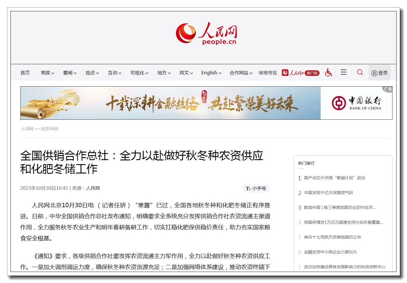 “寒露”已過,全國各地秋冬種和化肥冬儲正有序推進。日前,中華全國供銷合作總社發(fā)布通知,明確要求全系統(tǒng)充分發(fā)揮供銷合作社農(nóng)資流通主渠道作用,全力服務秋冬農(nóng)業(yè)生產(chǎn)和明年春耕備耕工作,切實扛穩(wěn)化肥保供穩(wěn)價責任,助力夯實國家糧食安全根基。