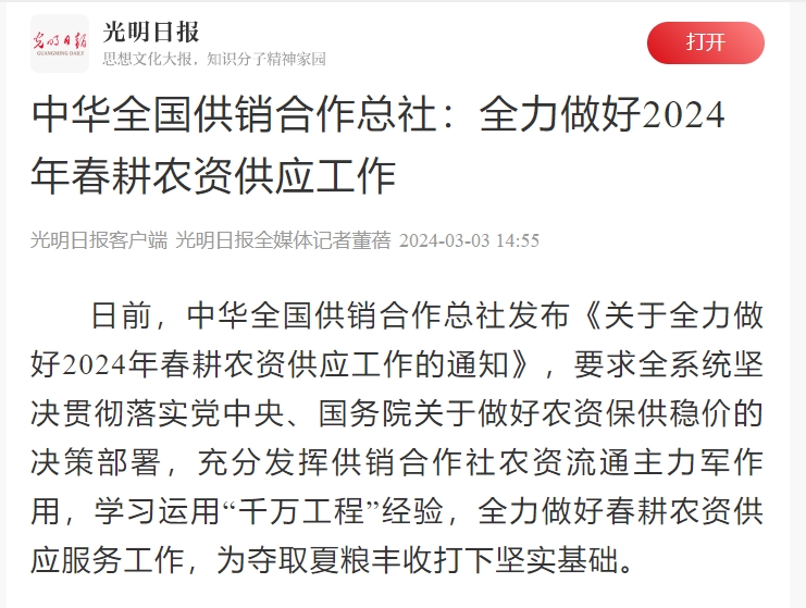 日前,中華全國供銷合作總社發(fā)布《關(guān)于全力做好2024年春耕農(nóng)資供應(yīng)工作的通知》,要求全系統(tǒng)堅(jiān)決貫徹落實(shí)黨中央、國務(wù)院關(guān)于做好農(nóng)資保供穩(wěn)價的決策部署,充分發(fā)揮供銷合作社農(nóng)資流通主力軍作用,學(xué)習(xí)運(yùn)用“千萬工程”經(jīng)驗(yàn),全力做好春耕農(nóng)資供應(yīng)服務(wù)工作,為奪取夏糧豐收打下堅(jiān)實(shí)基礎(chǔ)。